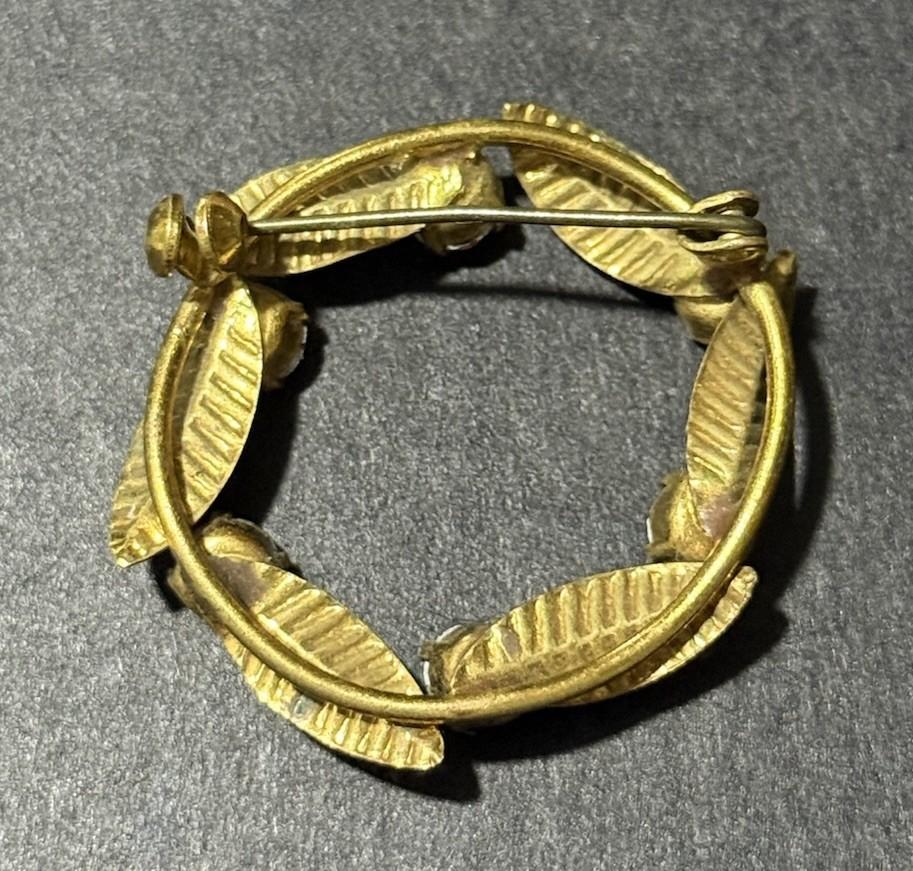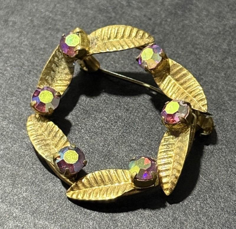 Gold Tone Brooch – Leaf Wreath with Purple Aurora Borealis Rhinestones
